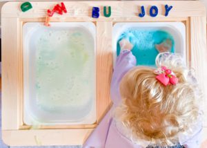 You can choose to do the colors of the rainbow or one color on its own! To incorporate science and encourage creative thinking, I chose yellow and blue and left it for Joy to make discoveries. She observed the colors, and made green. She even took it a step further and created different hues of green! Once again this proved that no matter the outcome I anticipate, child led play is the best direction to follow!