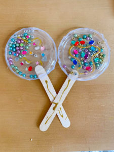 - Once dry, ask your child to choose beads/noise making items, and fill one side.
