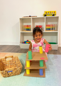 Building is a playful way for children to develop problem-solving skills, learn math vocabulary, and strengthen hand-eye coordination. Block building, stacking, and creating structures of any kind is also a wonderful way for children to build their independent play skills, be creative, and develop a strong sense of self esteem and achievement.