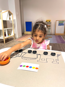 Lay out red, orange, yellow, green, blue and purple pom-poms in a container. Offer the index cards to your child and have them select one. Place that index card on the top of the train and encourage them to place the pom-poms in the wheels according to the way they are laid out on the index cards.