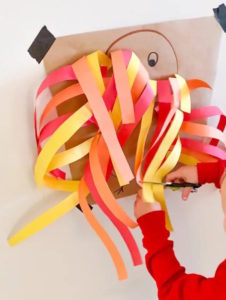 This is such a fun activity that strengthens those tiny hand muscles and develops scissor skills. Hanging the activity on the wall encourages the child to use whole arm muscles, which builds gross motor skills. My daughter had such an enjoyable time with this DIY turkey haircut activity, I might even suggest cutting more “hair!”