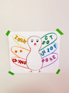 Offering wall activities requires children to use their whole arm which works different muscles than if they were sitting at a desk! Depending on your child’s age: you can encourage your child to peel rainbow dot stickers and place them on the corresponding feather, or offer rainbow letters and ask them match the color to the corresponding feathers while discussing the letter and sound it makes!