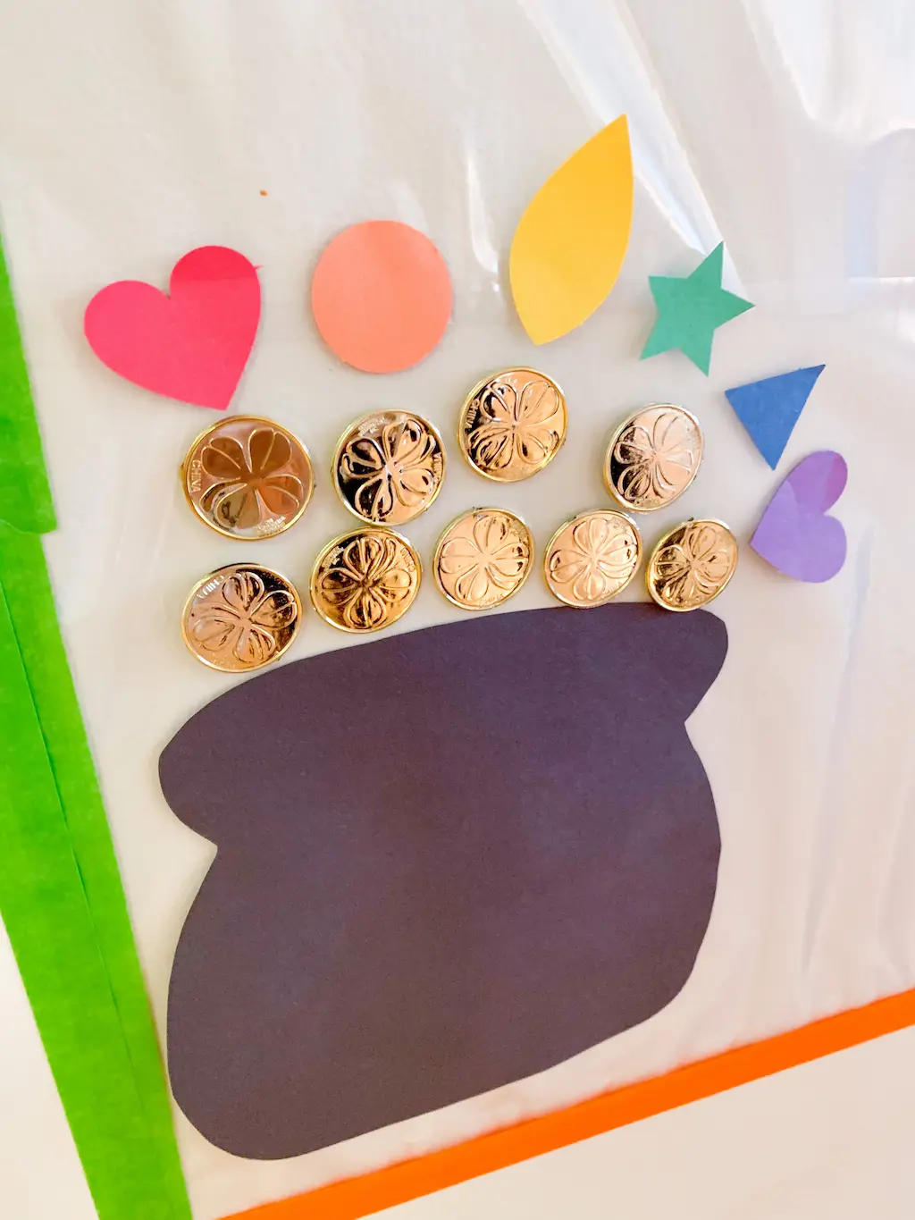 - Add the cauldron and encourage your child to add the gold and create a rainbow!